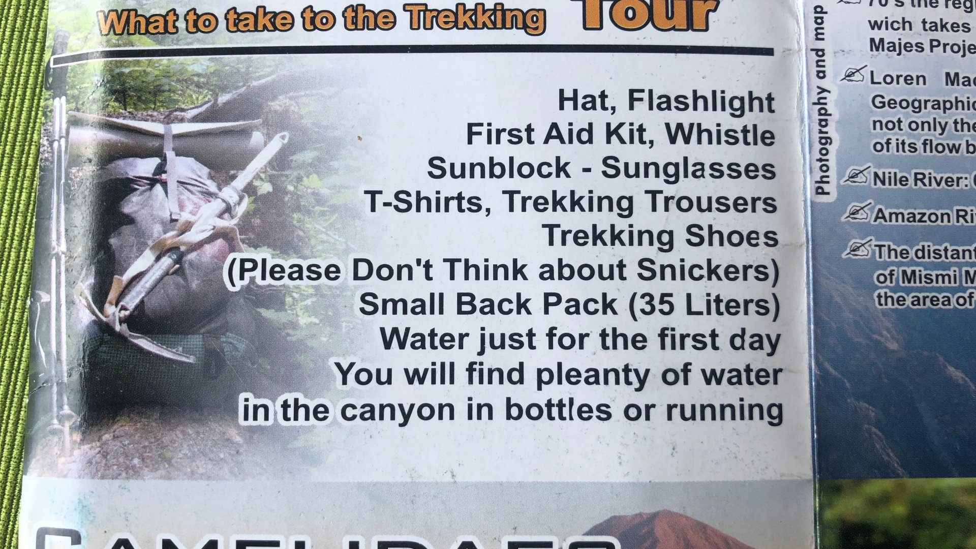 Tijdens de daling kijken we verbaast hoe een vader en moeder van een stel tieners met mega grote rugzakken aan het klimmen zijn, terwijl de kids zonder bagage lopen. Wij gaan er vanuit dat de pubers dit goed uit onderhandeld hebben. Met behulp van een hangbrug steken we de rivier over en lopen via een leuk smal paadje naar Casa Roy waar we superaardig ontvangen worden. De klim uit de canyon bewaren we voor morgen. Het is pas tien uur dus we hebben de hele dag om voor ons huisje te zitten en naar de berg te staren. Deze gaan we morgen beklimmen, 1200 meter de hoogte in, het lijkt onmogelijk. Zeker als je de toestand van onze benen beschouwt. De bovenbenen en kuiten hebben het zwaar.