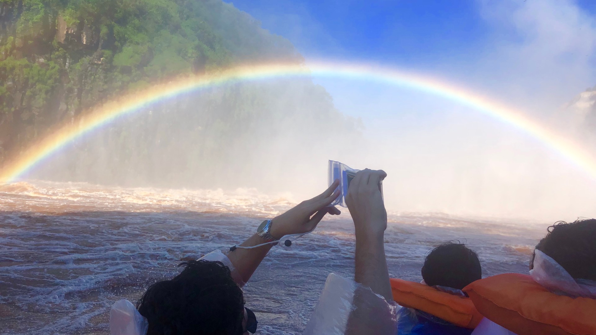 grensposten gezien te hebben, laat staan dat we gestopt zijn. De zon is uren geleden al ondergegaan. Een Braziliaanse beambte legt in het Portugees uit waar we moeten zijn. We keren, rijden weer terug naar Paraguay waar de beambten ons een short cut wijzen en binnen no time zijn wij en A3 uitgestempeld. In Brazilië gaat het net zo soepel en uiteindelijk rijden we half 9 de camping op in Foz de Iguaçu. We zijn hier natuurlijk om de beroemde watervallen te bewonderen. Met korte broek, slippers en poncho aan, staan we op een ponton te wachten op de Zodiac die ons vandaag dichtbij deze watervallen gaat brengen. Gisteren waren we zeiknat en ijskoud geworden, omdat we zo nodig ‘op’ en onder de waterval moesten lopen, dus vandaag zijn we beter voorbereid. Onze medepassagiers zijn net zo goed voorbereid. De schipper ziet dit als een vrijbrief voor een speelkwartier. We plonzen in iedere golf, varen ongeveer onder de watervallen door, nemen scherpe bochten en eindigen met een laag water in de boot. Tijdens deze pretpark waardige attractie hebben we ook nog even stil gelegen om de enorme vallende watermassa te bewonderen. De zon zorgt voor een prachtige regenboog waar we onderdoor varen. Het geluid van de watervallen is enorm.